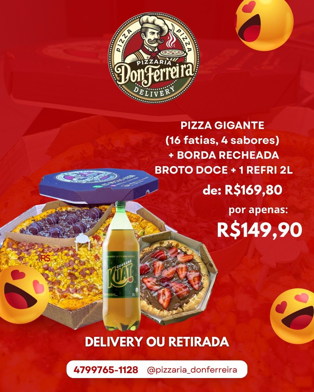 1 Pizza Gigante, 1 Broto Doce, 1 Refrigerante 2L, 2 Maionese, 1 Borda Recheada